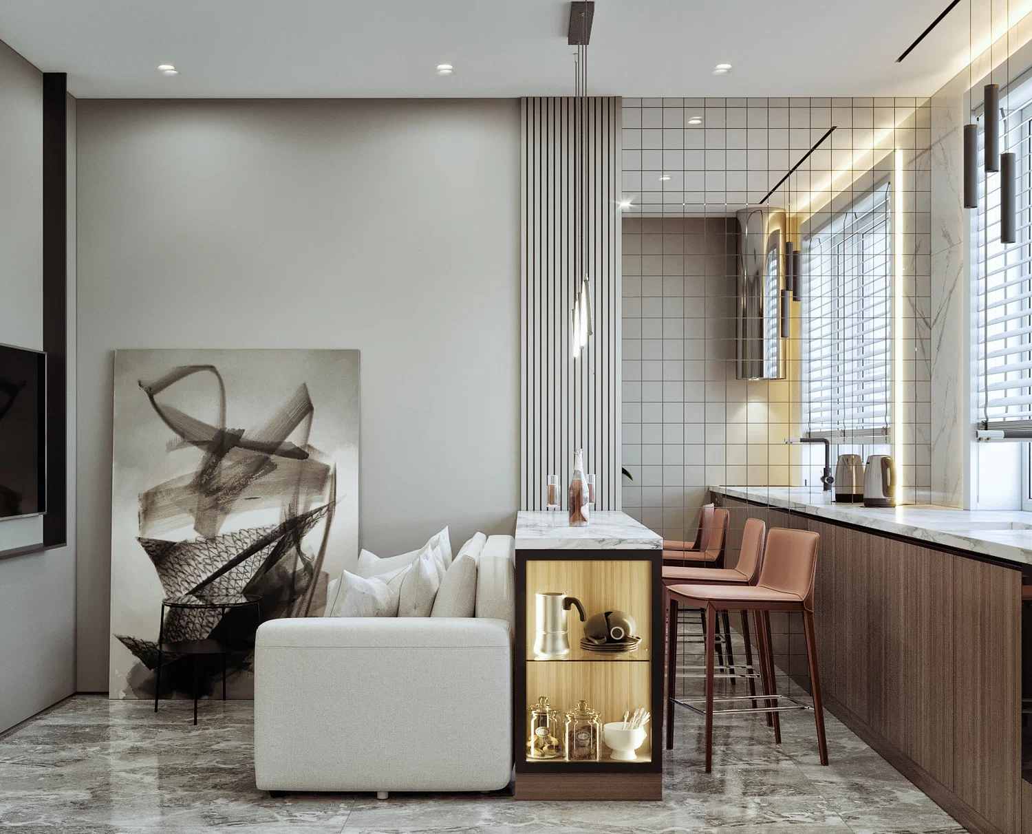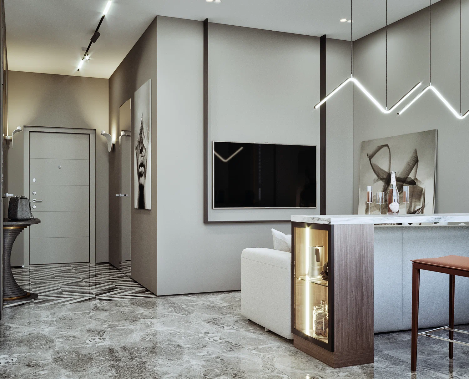 Апартаменты в современном стиле, оригинальный лаконичный дизайн, недорогой в исполнении.