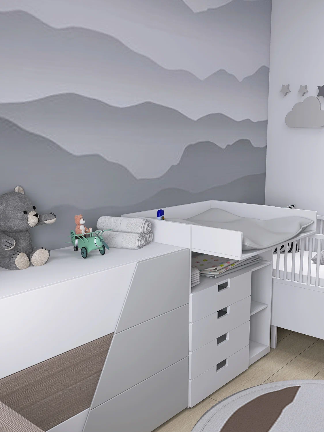 Что нужно для малыша, который вот-вот родиться? Конечно уютная детская комната. Заказчики попросили предоставить 3 варианта цветовой палитры (голубой, бирюзовый, серый). И выбор остановился на последнем варианте. Уютно, просторно, современно! Детская комната мальчика 9 кв.м.