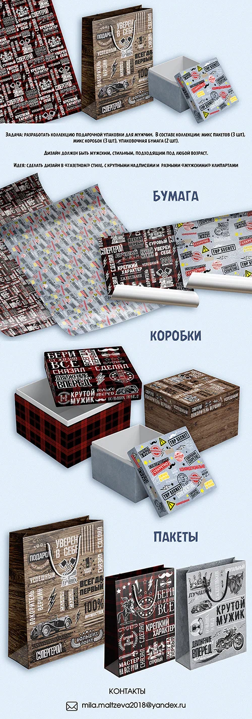 В ходе работы выполнены дизайны для: упаковочной бумаги, подарочных коробок, подарочных пакетов