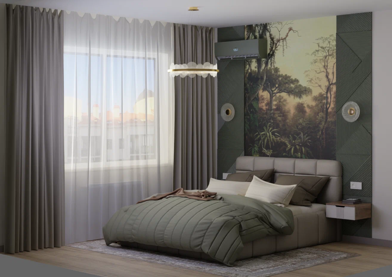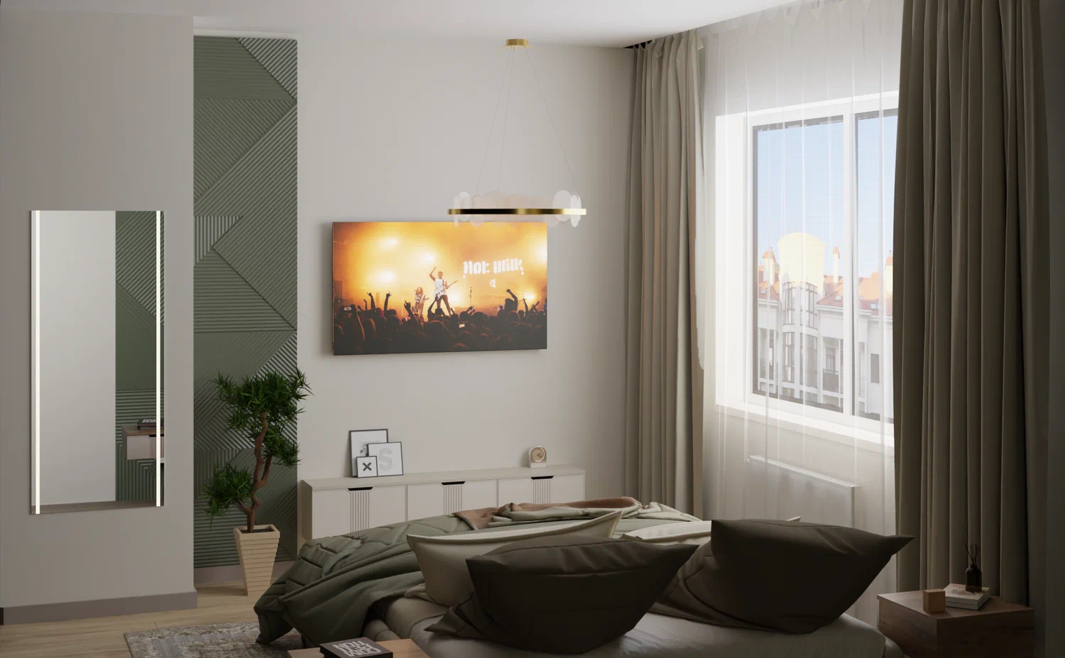 Было решено поставить холодильник в выстроенный выступ в спальне, который удачно продолжал проход в комнату. Диваны удалось разместить в зоне отдыха, в коридоре.