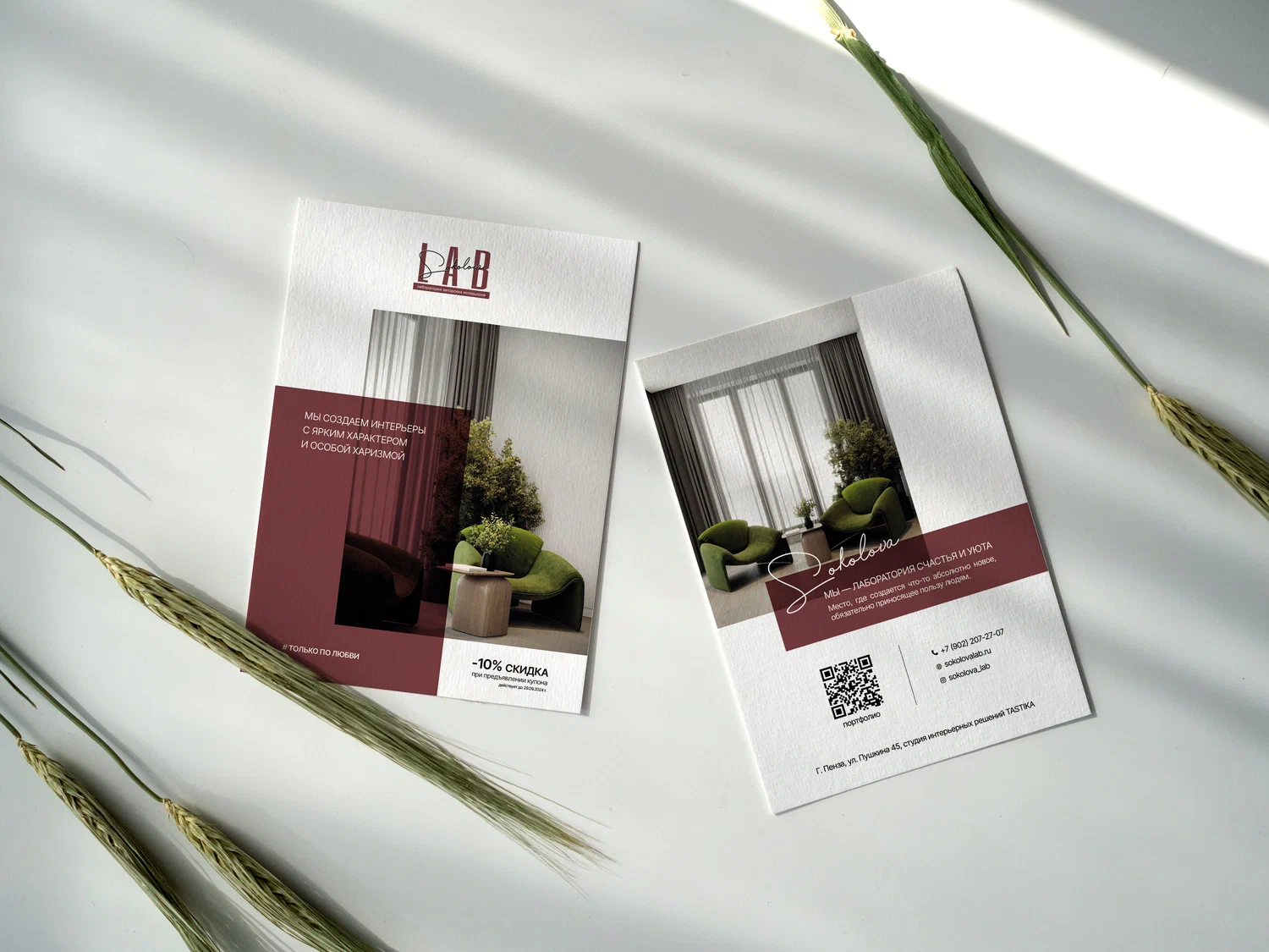 Разработан двухсторонний макет листовки для студии интерьерных решений. Срочный заказ, выполненный за один день по пожеланиям клиента, с опорой на фирменный стиль бренда.