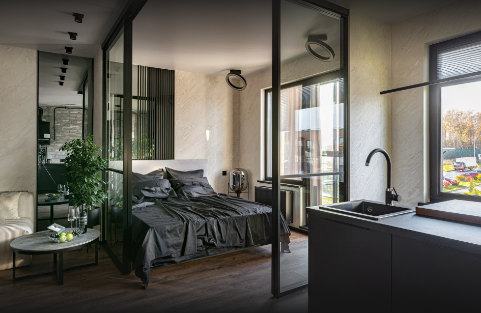 Спроектировали открытое перетекающее пространство разных функциональных зон с возможностью зонирования спальни стеклянными перегородками.