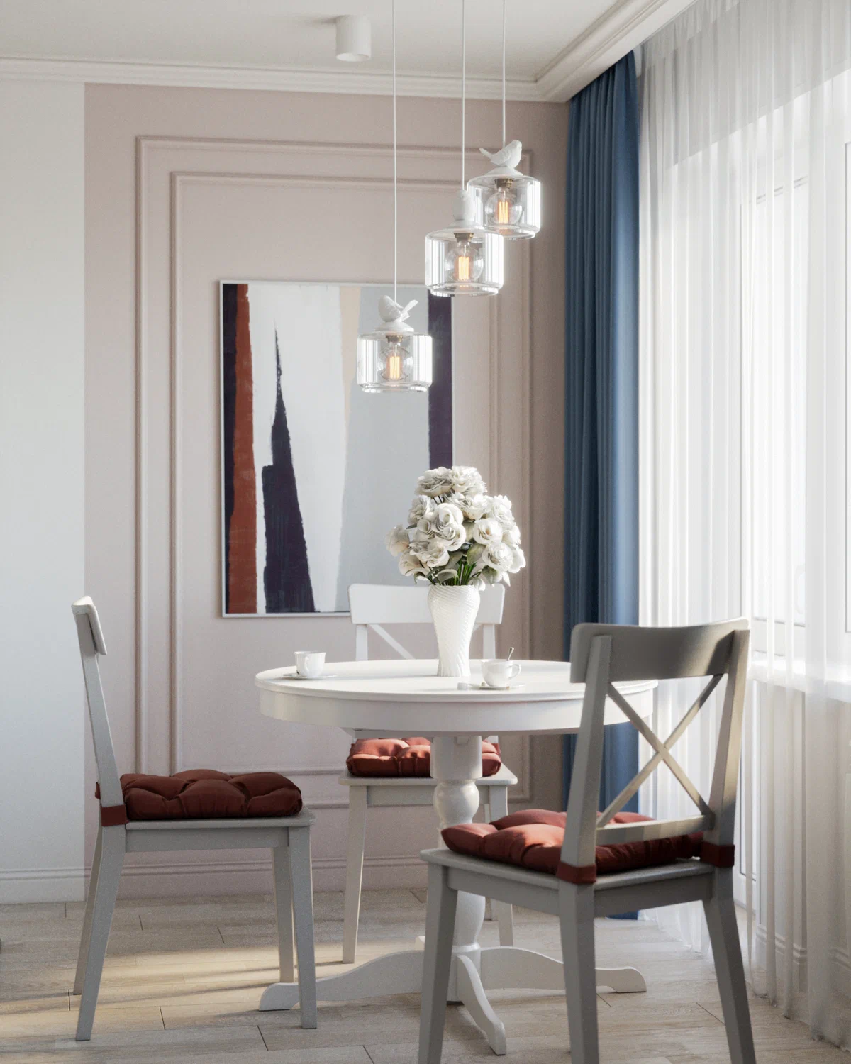 Интерьер выдержан в спокойных светлых тонах в сочетании с ненавязчивыми классическими формами. Приглушённые цветовые акценты немного разбавляют пространство, и дарят ему свою лёгкую и безмятежную энергию. Уюта пространству добавляют текстильные элементы.