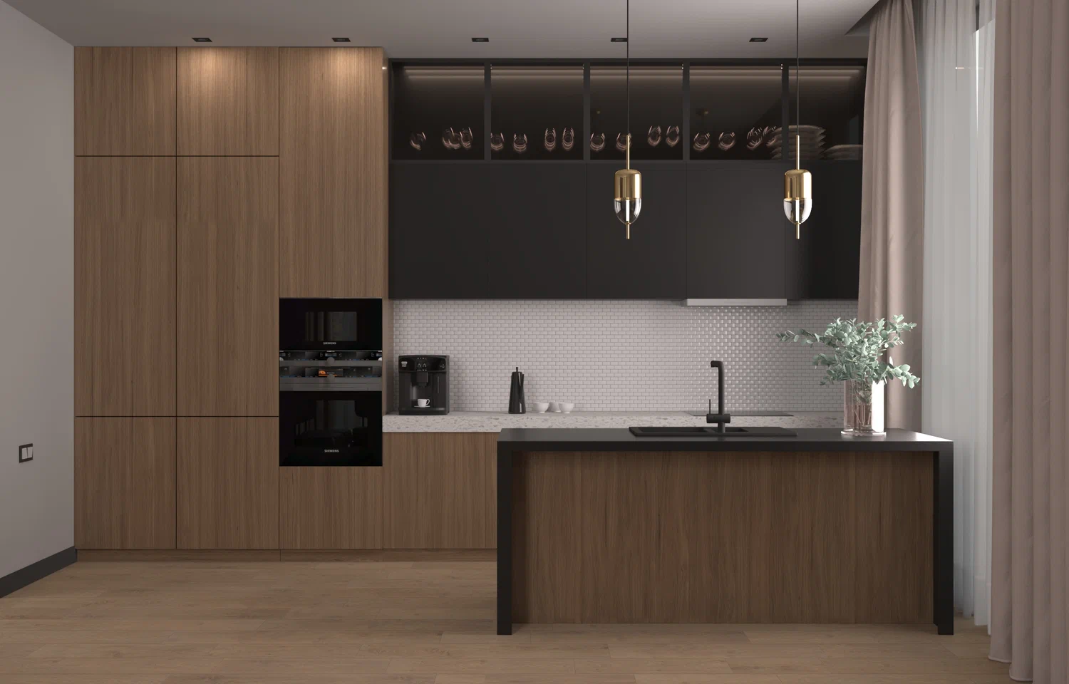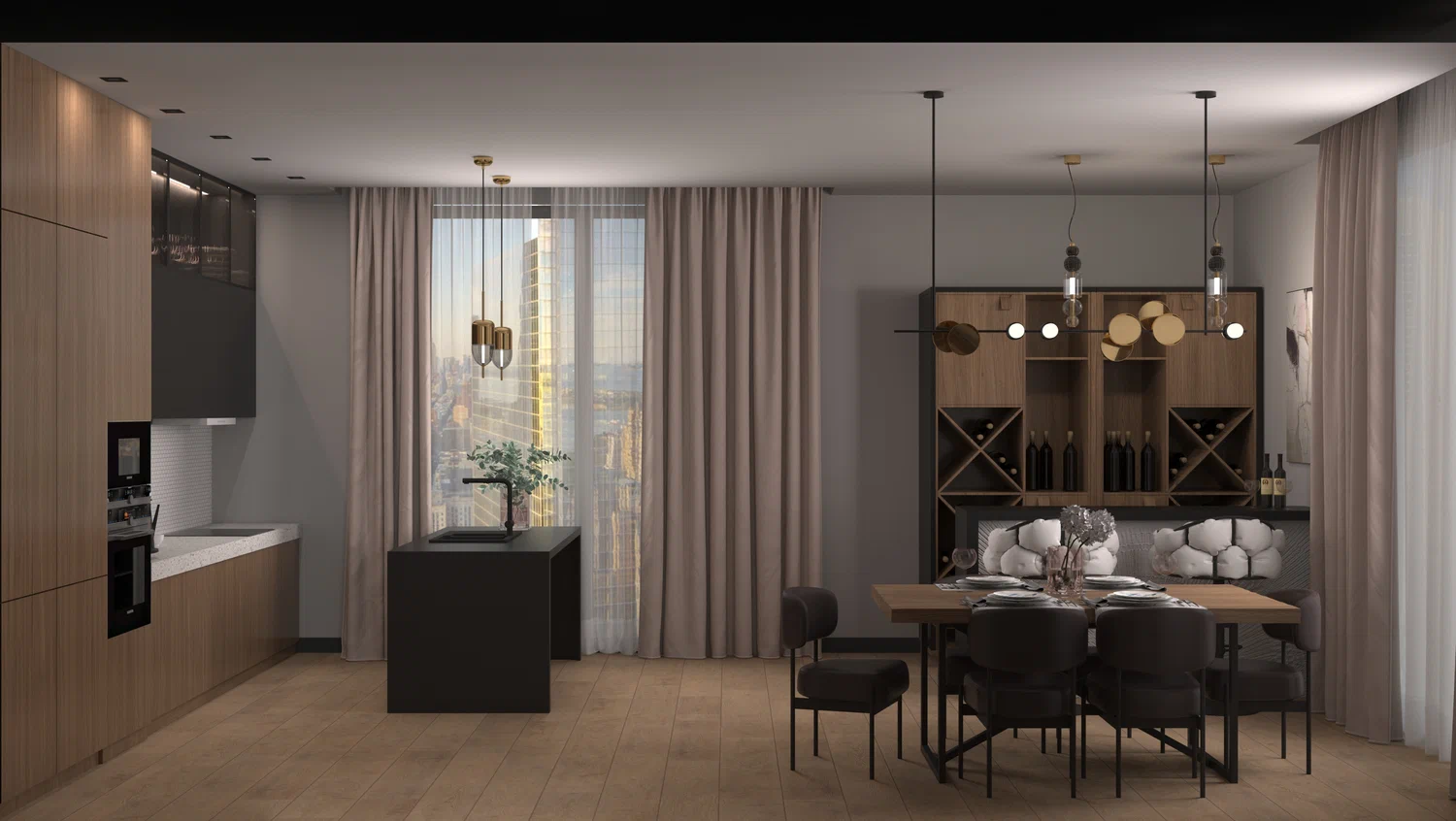 Очень стильный минималистичный дизайн-проект кухни гостиной в ЖК премиум класса. Из пожеланий заказчика главным критерием в создании дизайна был минимализм, но не в чистом виде, а смешанный, так как клиенту хотелось больше свободного места, но чтобы интерьер не был пустым. Главным акцентом, конечно, стала шикарный кухнный гарнитур в 4,7 метра с отдельным островом-мойкой. Достаточно редко сейчас ставят отдельные шкафы под вино, но так как для клиента создание вина - главное хобби, я выделила целую зону с винным шкафчиком и барной стойкой.