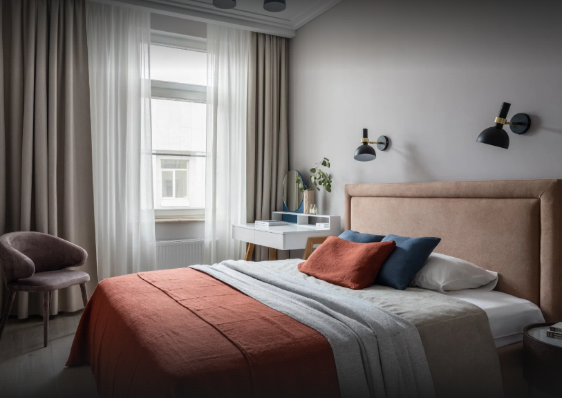 На площади 100 м² разместились кухня-гостиная, кабинет, спальня с прилегающей к ней ванной комнатой, прихожая и гостевой санузел, он же постирочная. Оформление интерьера построено на сочетании ярких интересных предметов мебели, света и неординарного соседства дорогих брендов мебели с более демократичными.
