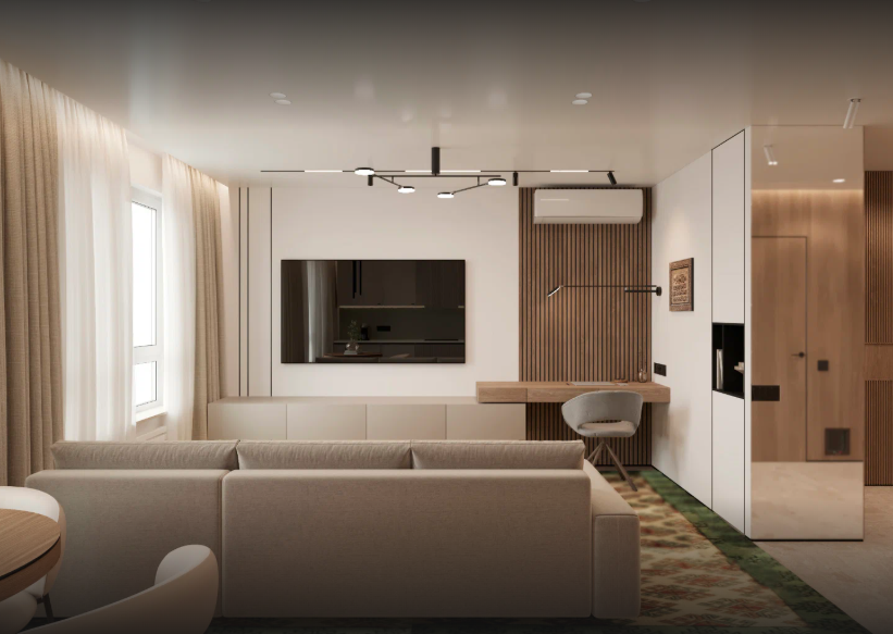 Основной задачей проекта являлось создание интерьера в современном стиле и максимально уютной и просторной атмосферой. Поскольку заказчица являлась счастливой обладательницей двух замечательных кошек, то отдельным пожеланием был максимально антивандальный интерьер. Этого нам удалось достигнуть при помощи следующих приемов: на стенах в наиболее истираемых зон прихожей положили керамогранит, стену со входами в ванну и санузел оформили настенными деревянными панелями, текстиль мягкой мебели и стульев выбирали не в темных тонах (что всегда подчеркивает шерсть животных). Хозяйка квартиры очень любит простор и хорошую освещенность, поэтому сценарии освещения многофункциональные, а также не забыли про применение зеркал, что всегда преумножает свет и расширяет пространство.