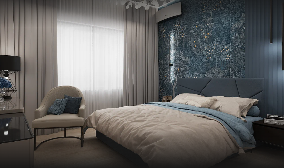Насыщенные приглушенные цвета фрески в изголовье создают атмосферу умиротворения и спокойствия. Каждая деталь, от мягкой текстуры до легкого света, наполняет пространство гармонией, приглашая нас в мир, где время останавливается.