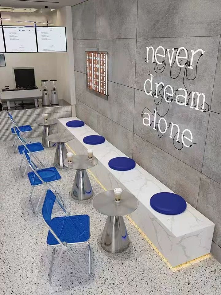 Создать фотореалистичную 3D-модель современного стула-трансформера из кафе. Модель должна точно повторять форму, пропорции и материалы оригинального стула: глянцевый металлический каркас, прозрачные пластиковые сиденье и спинка синего цвета, а также механические элементы крепления.