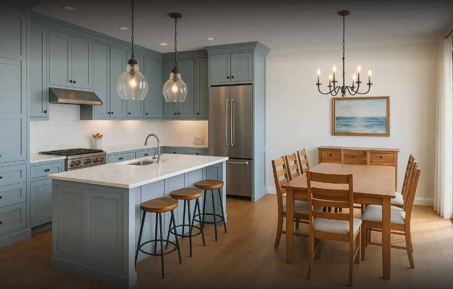 Работа для конкурса «Битва дизайнеров». Проект гостиной, кухни и столовой в загородном доме.