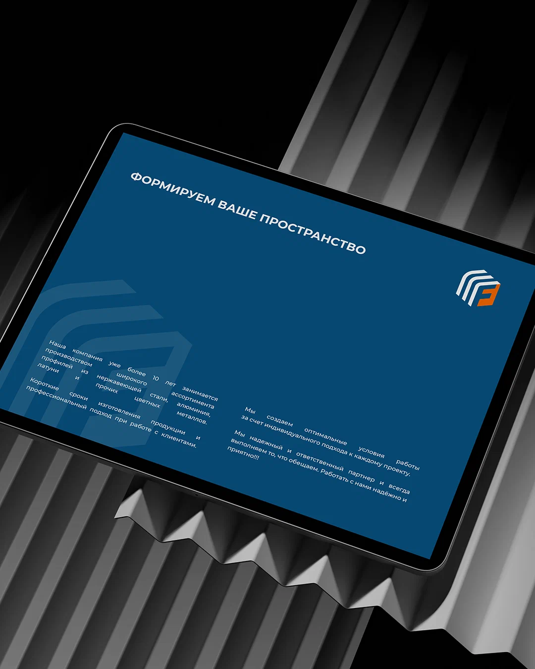 При создании логотипа важно было учитывать, что он должен быть минималистичным, но при этом передавать динамику и энергию. Это было достигнуто с помощью интересной геометрии символа, который отражает эстетику форм, характерную для металлических профилей и плинтусов.