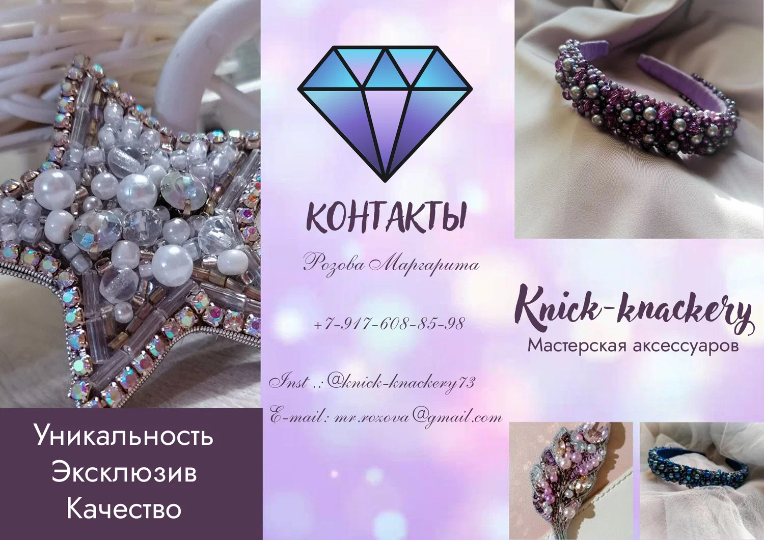 Разработка простого дизайна фирменного стиля для мастерской аксессуаров. Создано 2 буклета, визитка и логотип. Выполнены в едином стиле с использованием определенной цветовой палитры.