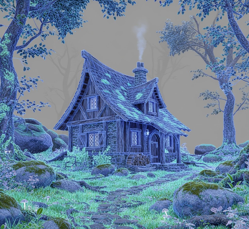 Создать фотореалистичное 3D-изображение уединенного домика, расположенного в густом лесу. Ключевая цель — передать атмосферу уюта, таинственности и спокойствия. Домик должен выглядеть обжитым, органично вписанным в природное окружение, с акцентом на детали лесного пейзажа и мягкое, естественное освещение.