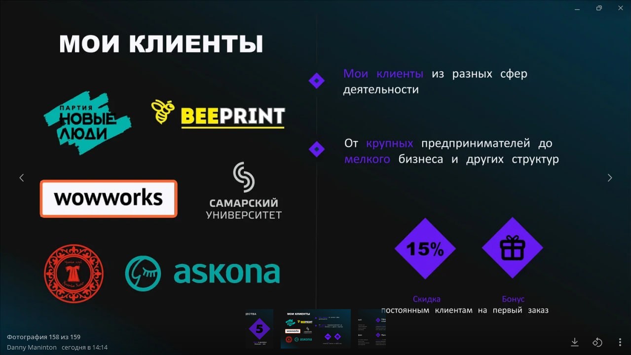 Презентация в фирменном стиле. На слайдах представлена актуальная информация об услугах, клиентской базе, о моих преимуществах и многое другое.