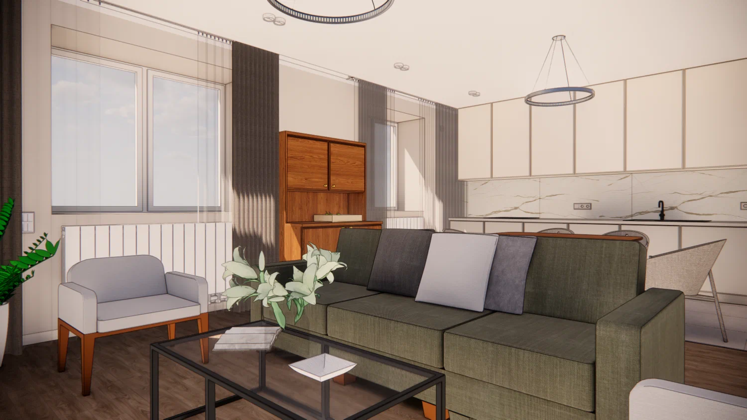 Мы спроектировали интерьер в спокойных серо-бежевых оттенках, в кухне-гостиной акцентом в обеденной зоне будет буфет, а в зоне объемный диван.
