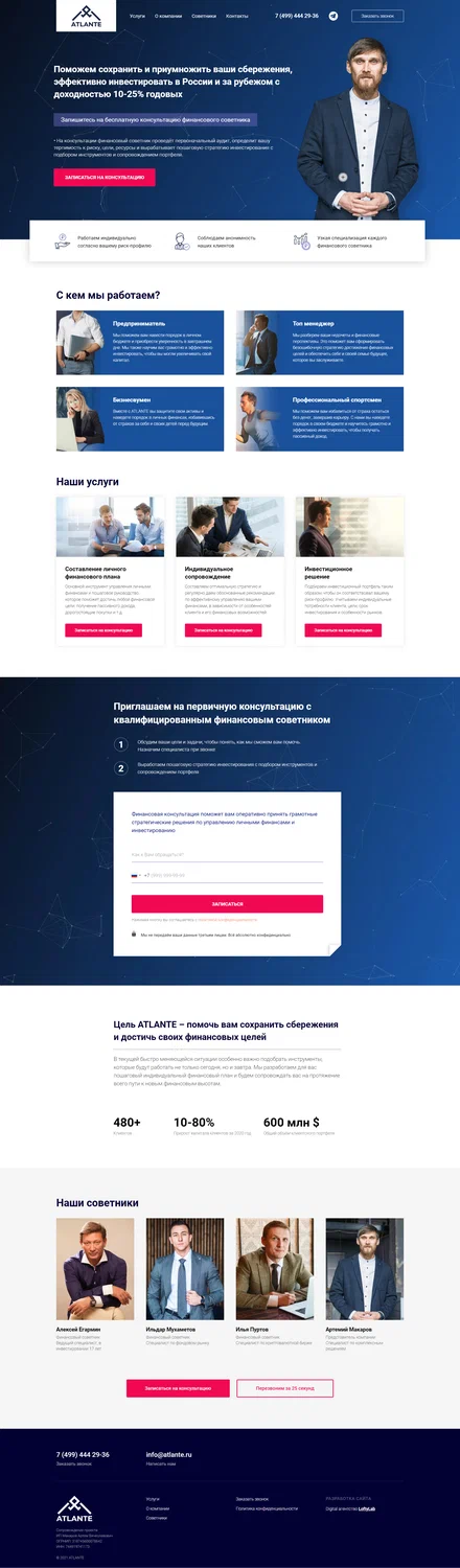 Разработал продающий Landing Page для компании, которая предлагает услуги финансовых консультантов для людей, заинтересованных в сохранении и приумножении капитала.